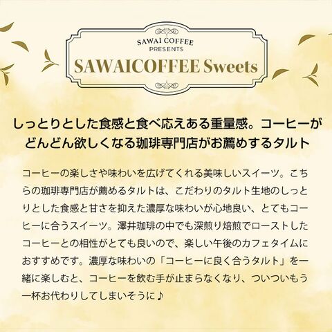 | こんな方にオススメです | コーヒーと一緒に楽しむため: タルトの甘さ控えめの味わいが、コーヒーの風味を邪魔せず引き立てるため、カフェタイムのお供として最適です バリエーションを楽しむため:味のバリエーションを楽しむために購入する方も多いです |